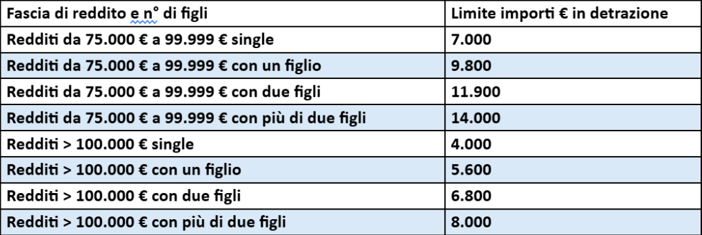 Viene inoltre introdotto un limite all’importo detraibile a seconda della fascia di reddito e del numero dei figli: